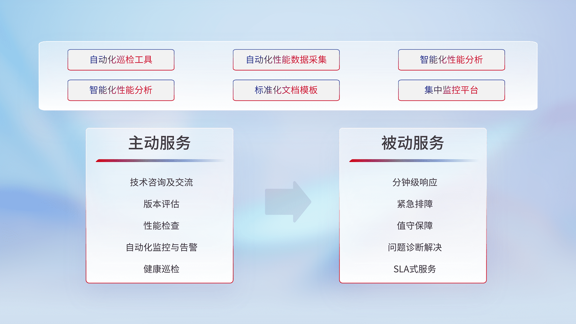 智能化工具和标准化文档,,,,保障服务质量,,,提供主动服务(包含技术咨询、、、、版本评估、、、性能检查、、自动化监控与告警、、、、健康巡检)和被动服务包含(分钟级响应、、、紧急排障、、、值守保障、、、问题诊断解决、、、、SLA服务)。。